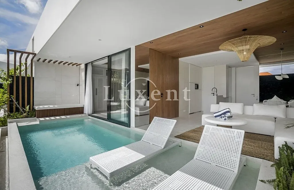 Vila o přibližné ploše 100 m² je navržena s důrazem na plynulý přechod mezi interiérem a exteriérem a maximální využití otevřených výhledů. Dispozici tvoří samostatná ložnice a obývací prostor s kuchyňským koutem, který navazuje na terasu se soukromým bazénem. Ložnice je orientována do zeleně a celek doplňuje elegantní koupelna. Interiér působí čistě, vyváženě a je připraven k okamžitému užívání bez nutnosti dalších investic.