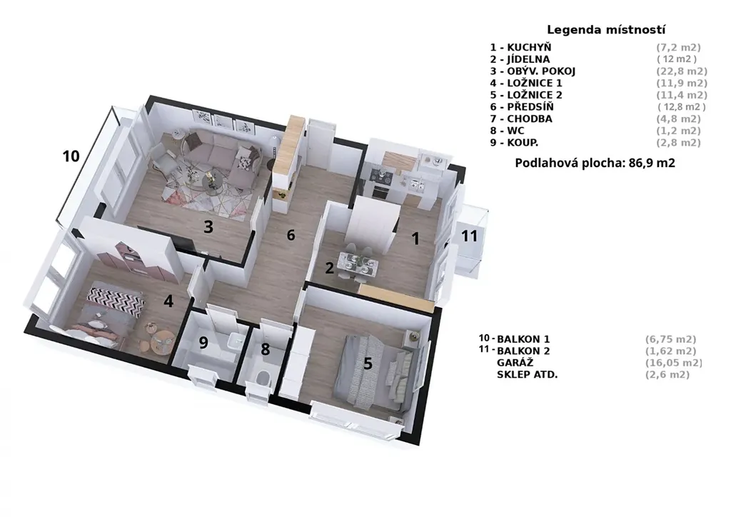 Podlahová plocha bytu je 82 m2, k tomu dva balkony celkem 8,4 m2 a sklep 2,6 m2. Byt se nachází ve zvýšeném přízemí a má dobrou dispozici. Vytápění je ústřední ze společné plynové kotelny v domě, ohřev vody vlastním kotlem.