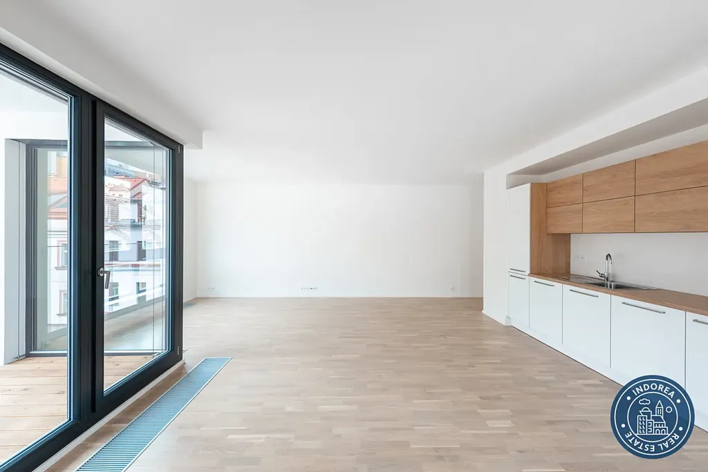 Dominantou je velkorysý obývací prostor o velikosti 42 m² s luxusní kuchyňskou linkou, dřevěnými podlahami a velkoformátovými dřevěnými okny. Jižní orientace zaplavuje interiér přirozeným světlem po celý den a plynule navazuje na příjemnou terasu pro ranní kávu i večerní relax. Jednotka je umístěna na rohu budovy a poskytuje tak rovněž vysokou míru soukromí díky minimálnímu počtu sousedů.