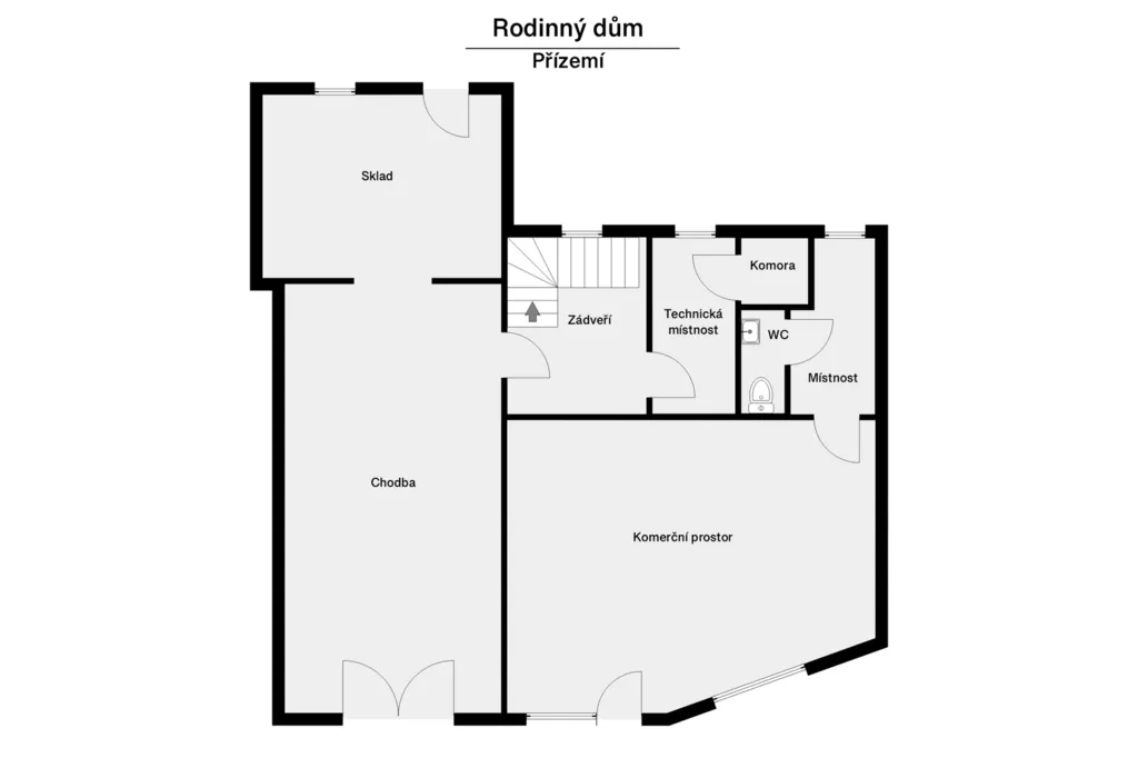V přízemí se nachází nebytový prostor o výměře cca 55 m2, který je nyní pronajímán a generuje pravidelný příjem. Dále je zde garáž, dílna a technická místnost se studánkou. Voda ze studánky je využívána jako užitková pro splachování WC.