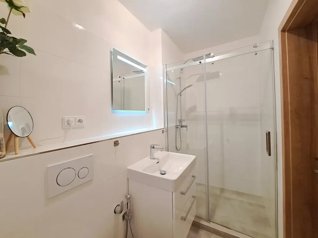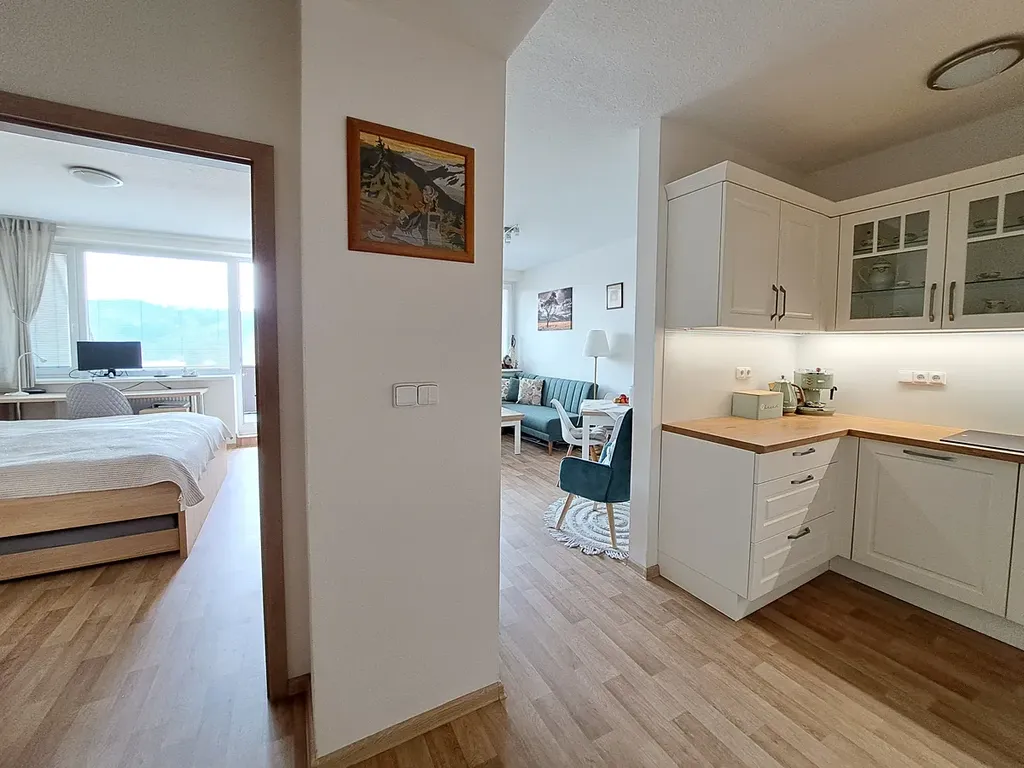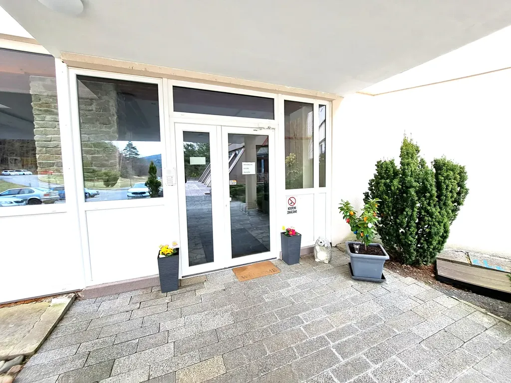 Apartmán má výměru 46 m2 + dvě terasy 8 m2 a najde zde příjemnou atmosférou, pohodu i vkus. Prošel celkovou rekonstrukcí a je plně vybaven dle fotodokumentace v inzerci včetně nové kuchyně od firmy Gorenje s vestavěnými spotřebiči lednicí, myčkou, el. troubou - vše značky Gorenje. Dispoziční řešení: vstupní chodba, koupelna (WC-Geberit, umyvadlo, sprchový kout, pračka i sušička), kuchyň je krásně propojena s obývacím pokojem, který má přímý vstup na terasu, dále ložnice s přímým vstupem na druhou terasu. Sklep je umístěný v přízemí budovy. Obec a její kopcovité, zalesněné okolí, které je rájem pro houbaře, jsou součástí Vizovické vrchoviny. Přehradní nádrž pod domem je určena pro rekreaci, rybaření a plavání.