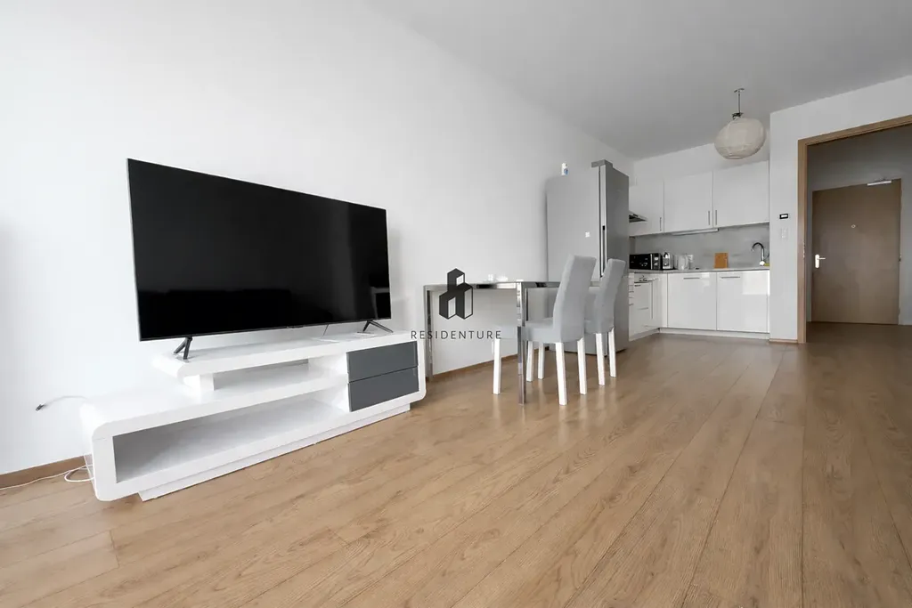 Byt je kompletně vybaven – kuchyňská linka zahrnuje varnou desku, troubu, myčku, digestoř a vestavěnou lednici. Součástí vybavení je také jídelní stůl a sedací souprava.