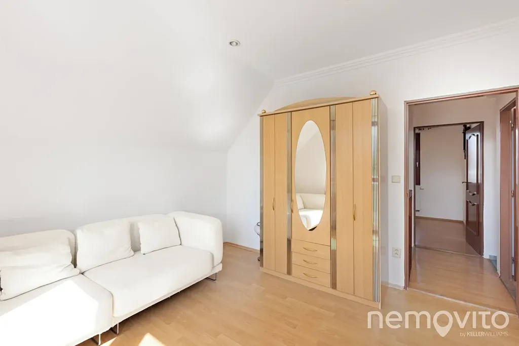 Horní podlaží tvoří 3 ložnice a 2 koupelny. Velikosti pokojů jsou 10, 13 a 16 m2. Ve štítu domu je pak výstup na balkon (3 m2). Zahrada (971 m2 bez plochy domu) je sdílená a její rozdělení k užívání je možné dle dohody, nicméně k dispozici bude ta část, která náleží k levé či pravé polovině stavby. Nemovitost se nachází v lokalitě Zámostí, tedy zhruba 500 m pěšky od Jiřího náměstí. Okolí tvoří pouze několik domů, přičemž tento je ve druhé řadě od řeky Labe. Dům bude pronajat výhradně dlouhodobě, a to spolehlivému a prověřenému nájemci.