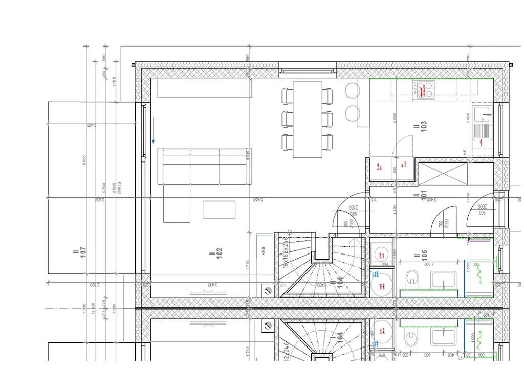 Dispozice pak nabídne v 1. NP obývací pokoj s rohovým krbem a přímím vstupem na terasu, jenž je plynule propojený s prostorem kuchyně. Ta je osazena novou kuchyňskou linkou (viz foto) se spotřebiči (lednice s mrazákem, myčka, digestoř, mikrovlnná trouba, elektrická trouba, varná deska, koš na tříděný odpad, dřez + baterie), chodbu s vestavnou skříní, botníkem, technickou místnost s kotlem a boilerem, s wc, umyvadlem, sprchou.