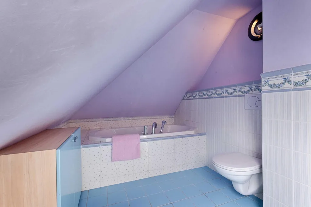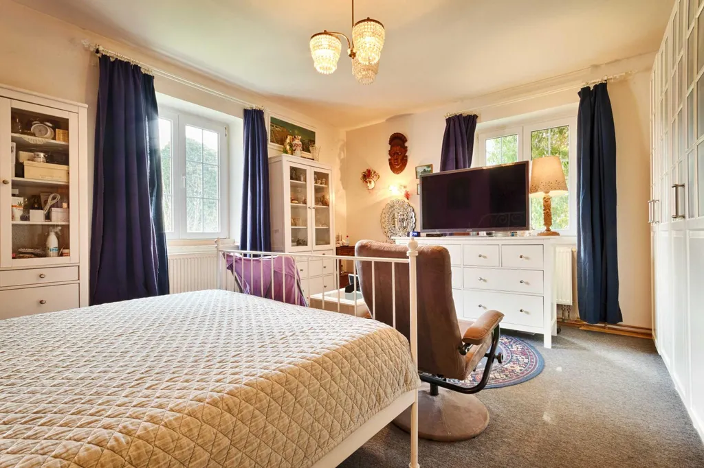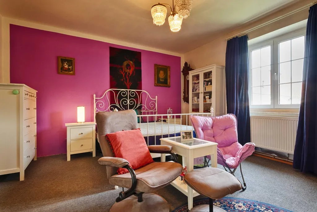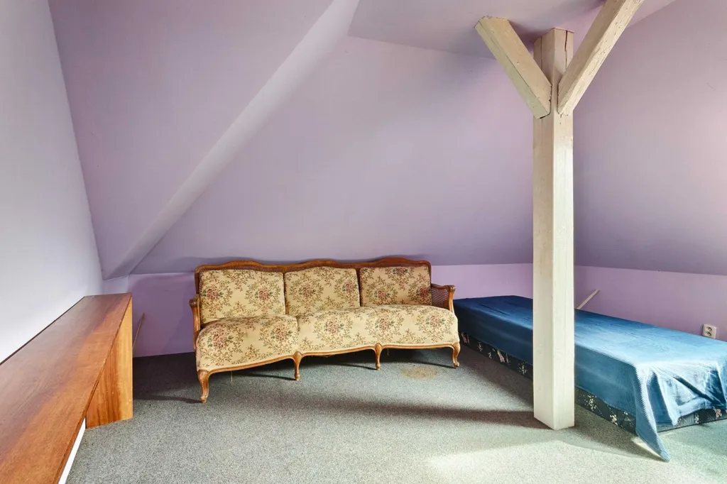 Jakmile po schodišti vystoupáte z přízemí do prvního patra, nabídnou se vám útulné podkrovní místnosti. Je tu koupelna s vanou a další tři pokoje, sloužící aktuálně jako ložnice. První ložnici s dřevěnými trámy je možné stavebními úpravami proměnit na kuchyni. Při větších úpravách je tedy možné v domě vytvořit dvougenerační bydlení, zatímco ve své stávající podobě je ideální pro rodinu s dětmi, jež mohou mít v horní části své vlastní království.