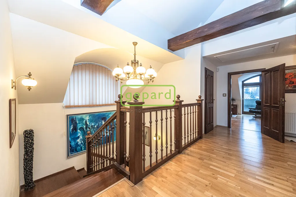 Dominantou domu je vnitřní bazén s protiproudem a samostatným odvlhčováním, dále posilovna, krb a tři plnohodnotné koupelny. Interiér je proveden z kvalitních a trvanlivých materiálů – dřevěná eurookna, masivní dubové schodiště, keramické dlažby a dřevěné podlahy – s důrazem na eleganci a dlouhodobou hodnotu.
