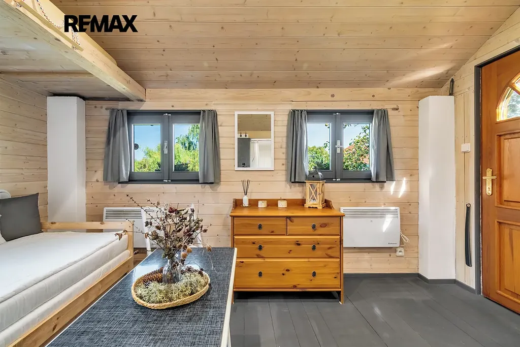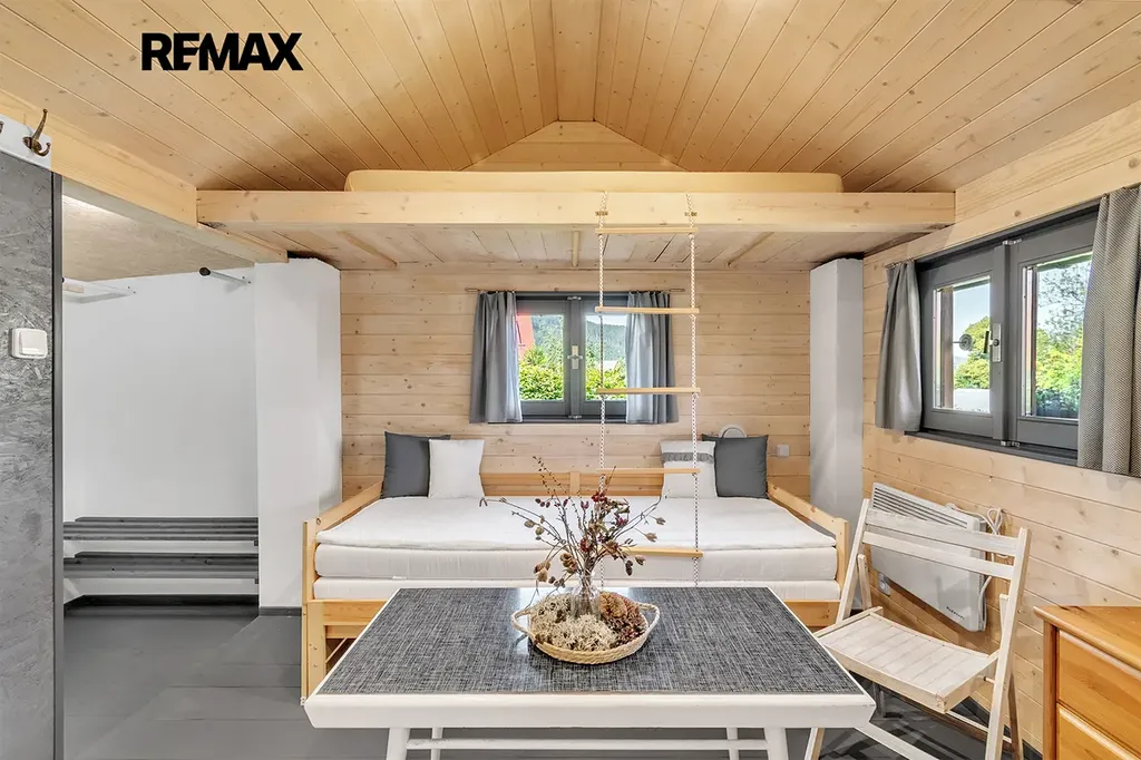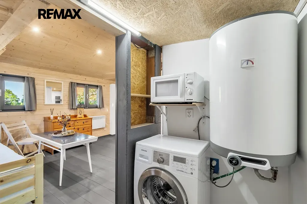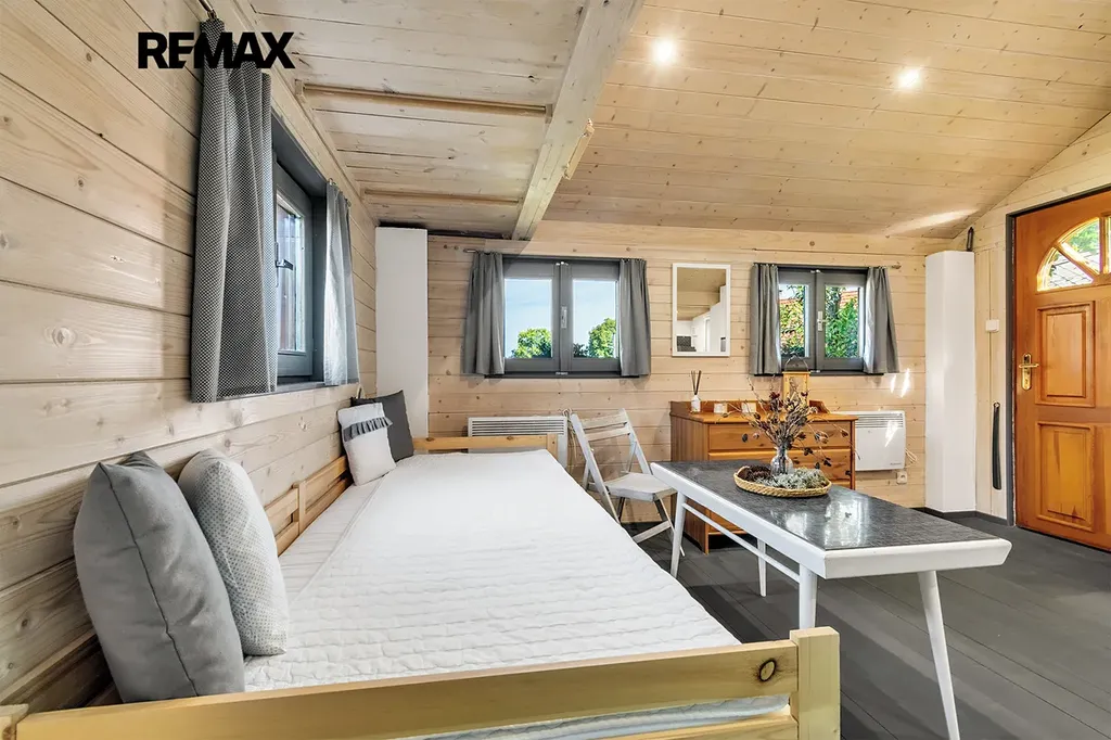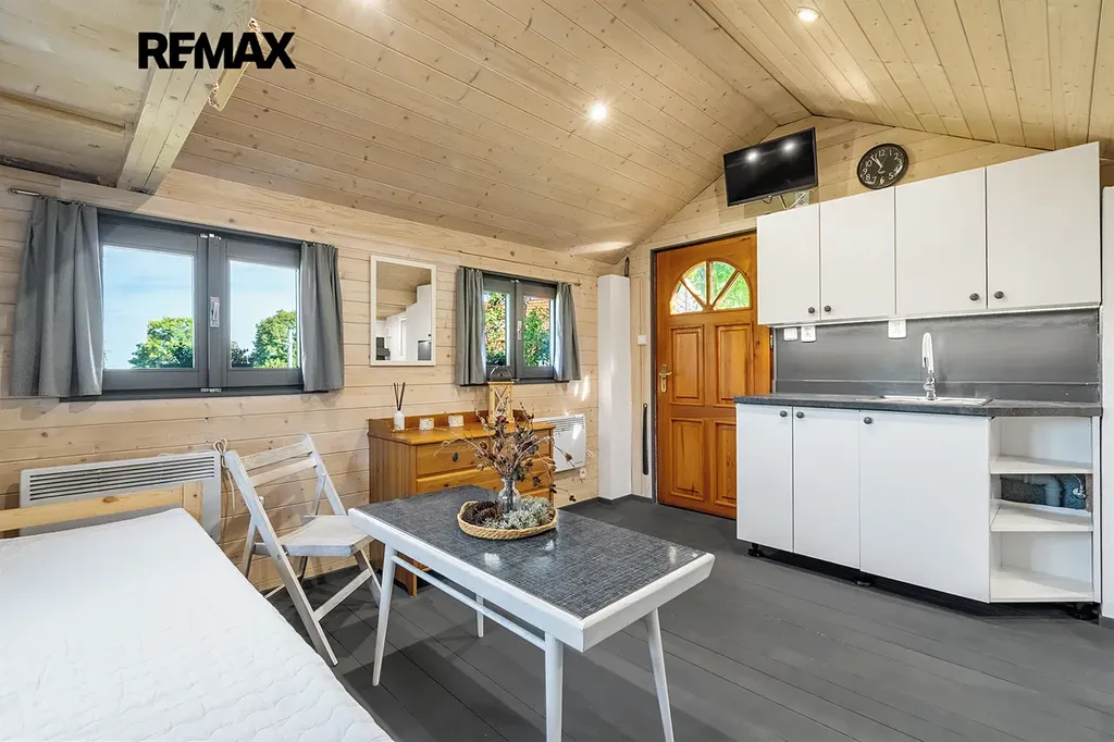 - vybavení: dřevěná podlaha, dřevěná okna, kuchyňská linka s přípojkou na myčku, umyvadlo, sprcha a WC, šatna s místem na pračku, lednice, TV