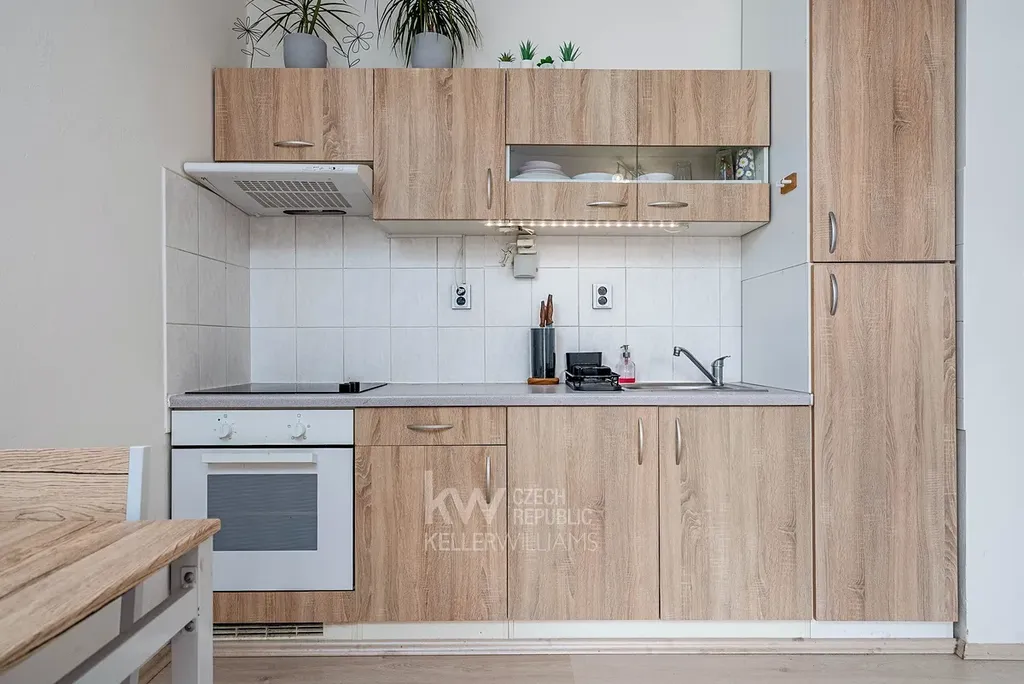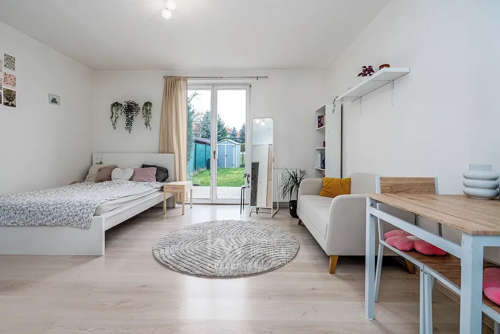 Dominantou bytu je obytný prostor s kuchyňským koutem a přímým vstupem na vlastní zahradu, orientovanou na západní stranu. Právě venkovní prostor dodává bytu příjemný rozměr navíc – ať už pro posezení po práci, ranní kávu, pěstování bylinek nebo jednoduché každodenní užívání bez kompromisů.