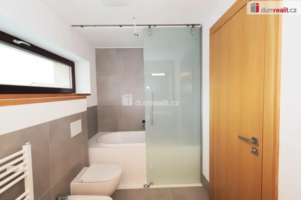 Hledáte nadstandartní dům v blízkosti budoucí stanice metra? Tak právě pro vás zde mám multifunkční, vícegenerační rodinný dům s dispozicí 6+kk v Praze 12 – Libuš, který je vzdálen pouze 2 minuty pěšky od budoucí stanice metra D a je v uzavřeném rezidenčním areálu s dalšími 15 domy. Celková podlahová plocha domu je 285,3 m², jsou zde dvě terasy (73,9 m²), plocha pozemku je 261 m² z toho zahrada má celkem 128 m². Dispozice tohoto moderního, nízkoenergetického domu tvoří v přízemí: prostorný obývací pokoj + kk (63,2 m²) se vstupem na terasu (20,1 m²), pracovna (15 m²) s vlastní koupelnou s WC (4,2 m²) a zádveří (7,5 m²). Po schodišti (6,6 m²) obloženém dřevem se dostaneme do 1. patra (2NP), kde je hlavní ložnice (21 m²) s šatnou a vlastní koupelnou s WC (8,5 m²), dále centrální koupelna (6,6 m²) s WC a bidetem, hala (5,8 m²) a dva dětské pokoje (18,6 + 19,5 m²). Po dalším schodišti se dostaneme do menší chodby (6,3 m²), která velkoformátovým oknem s HS portálem navazuje na panoramatickou terasu 74,4 m², která je z části krytá (prostor na vířivku) a je orientována na východ, sever a západ. Z obývacího pokoje se po schodišti dostaneme do suterénu domu, kde je multifunkční místnost, kterou můžete zcela upravit podle svých potřeb. Tato místnost má nadstandartních 62,4 m² a můžete zde mít opravdu cokoliv – např. samostatnou bytovou jednotku 1+kk s koupelnou a WC, kinomístnost, karaoke, panský klub, fitness anebo svoji soukromou pracovnu (např. pro advokáty, architekty, projektanty, daňové poradce apod.). Tato místnost je nedokončená a je připravena na úpravy dle vašich představ. Místnost má také přístup přímo z garáží – velmi výhodné. V suterénu domu je dále chodba se zádveřím a sklep / tech. místnost (12,3 m²) a komora (5 m²), kde je umístěný plynový kondenzační kotel. Ze suterénu je také vstup na zahradu (98 m²), která je kaskádovitá. Další zahrada je před vstupem do domu (30 m²) ve vnitrobloku. V celém domě je podlahové topení, okna jsou dřevěná, v obývacím pokoji a na terase je HS portál, u všech oken je příprava ne před okenní žaluzie, v domě je zavedeno optické vlákno na internet, podlahy jsou dřevěné vč, obložení schodiště. Vstupní dveře do domu jsou bezpečnostní, interiérové pak také dřevěné s obložkami. V areálu tohoto projektu je klid a soukromí. Osobně mohu doporučit, můj velmi blízký přítel zde bydlí, rád vám jako zájemci o koupi může předat další informace. Tento dům je rohový a celý projekt je umístěn na konci slepé ulice se vstupem do budoucího parku navazují až ke stanici metra D. Velmi vám doporučuji prohlídku tohoto domu 6+kk (285,3 m²), který vás svou velikostí ohromí, dispozicí nadchne, a nakonec chytí za srdce. Kompletní webová prezentace tohoto domu s více fotkami, plánky a informacemi je na našich webových stránkách. Ev. číslo: 655256.