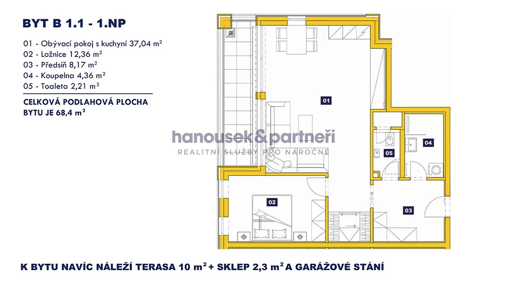 Nabízím vám byt s dispozicí 2+kk o velikosti 68,4 m2. V bytě je obývací pokoj s kuchyní, ložnice, předsíň, koupelna se sprchovým koutem a samostatné WC. Nachází se v 1. patře domu B a navíc k němu patří terasa s výměrou 10 m2, sklep a garážové stání.