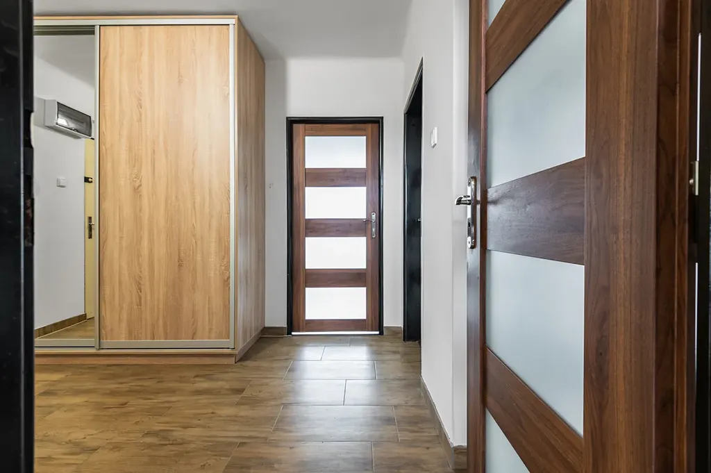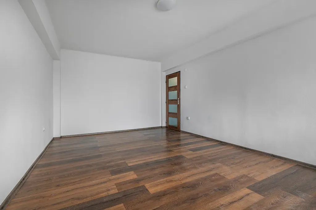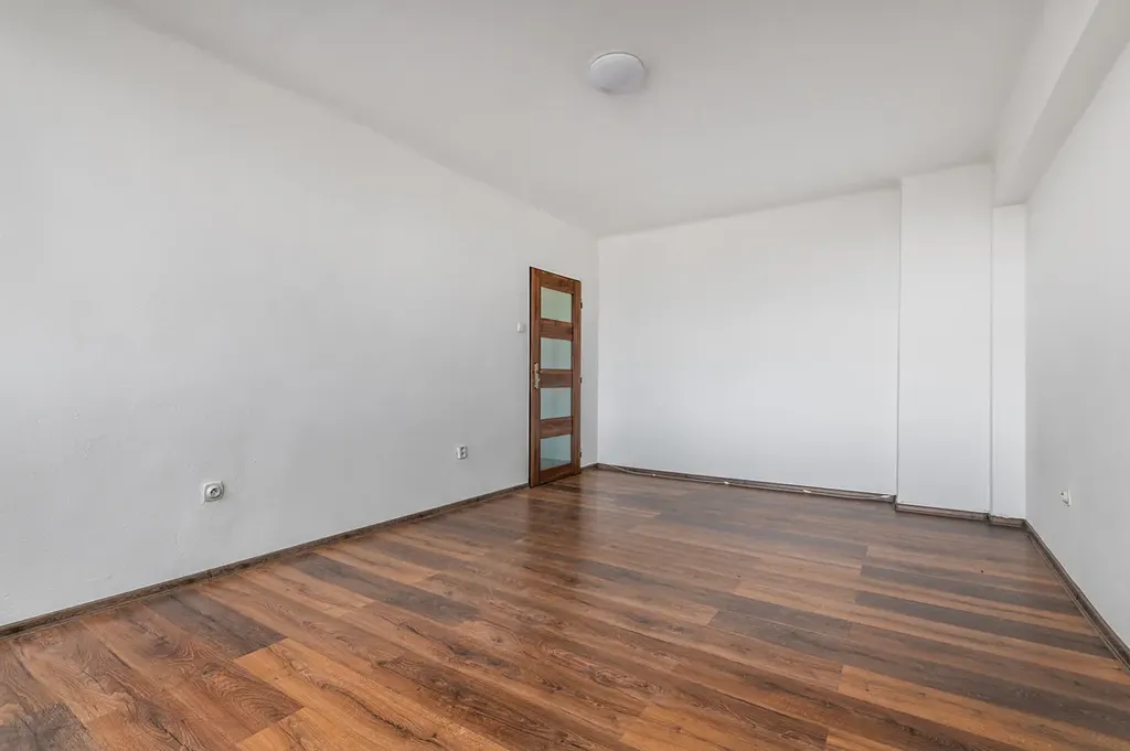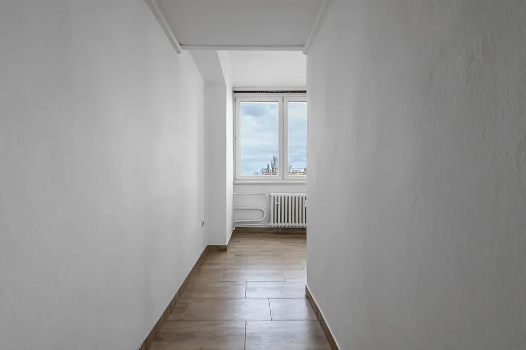 Dispozice bytu je velmi praktická – všechny místnosti jsou přístupné z centrální chodby, což zajišťuje pohodlné a přehledné uspořádání. Byt nabízí prostorný obývací pokoj a dva další velké pokoje. Byt působí velmi dobrým dojmem. Je prostorný a světlý.