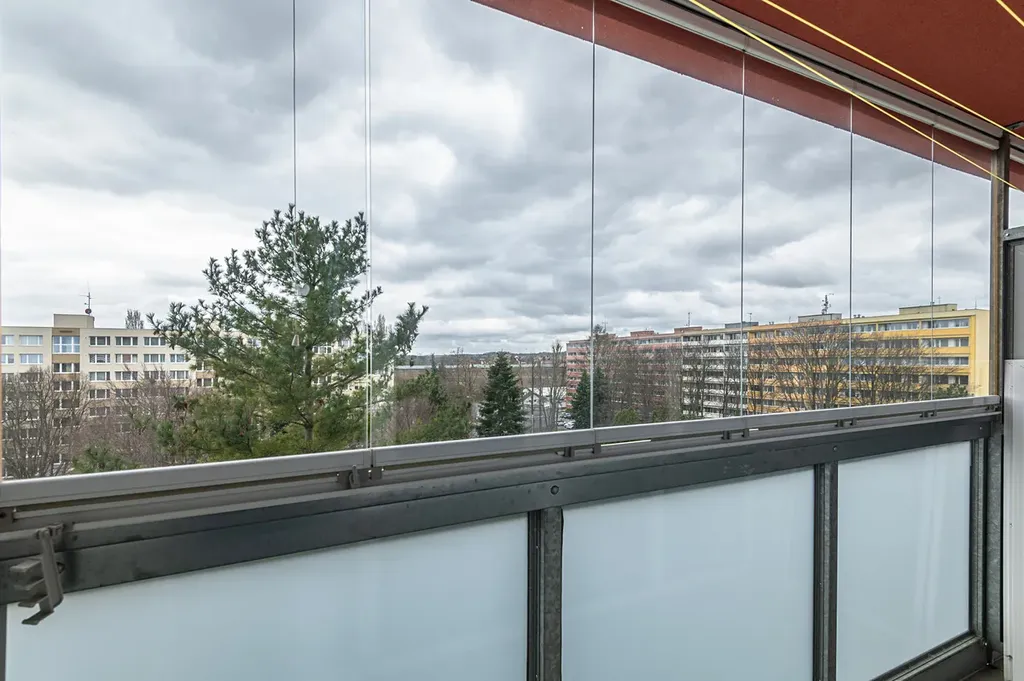 Dva pokoje mají celoprosklené stěny se vstupem na zasklenou lodžii, které poskytují hodně denního světla a příjemné propojení interiéru s venkovním prostorem.