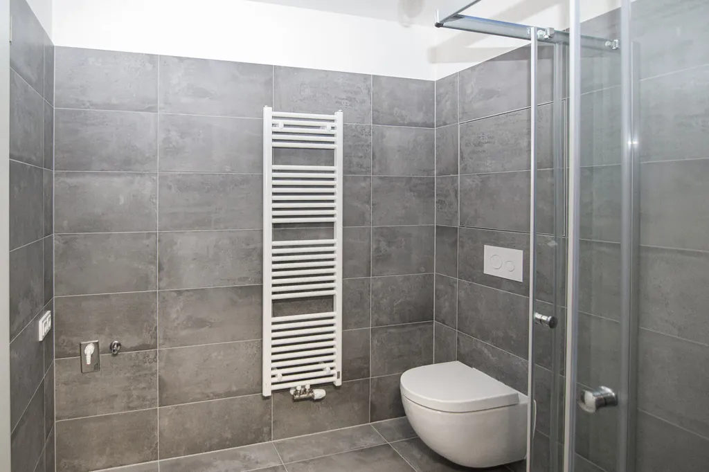 Koupelna je společná s toaletou a nabízí prostorný sprchový kout, umyvadlo s galerkou a zrcadlem a dostatek místa pro pračku i sušičku.