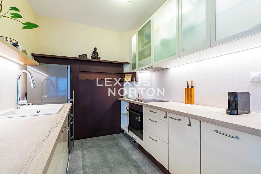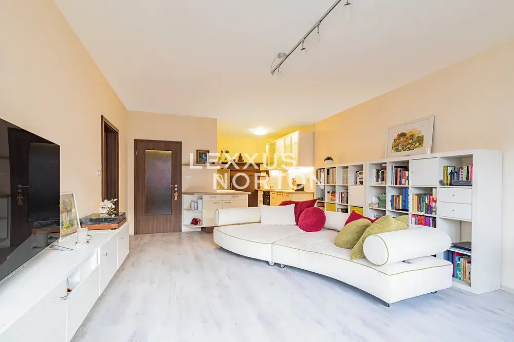 Kuchyňská linka s kompletní sadou spotřebičů. Dřevěné plovoucí podlahy v obytných místnostech. V hale a koupelně velkoformátová dlažba. Rozměrné vestavěné skříně v hale a v ložnici.
