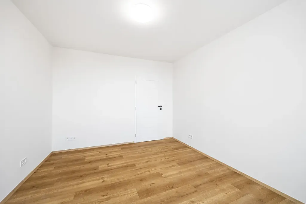 Dominantou bytu je prostorný obývací pokoj s kuchyní na míru o celkové ploše 31 m². Kuchyň je plně vybavena vestavnými spotřebiči (elektrická trouba, mikrovlnná trouba, indukční deska, myčka nádobí) a přirozeně navazuje na obytný prostor. Koupelna je řešena velmi velkoryse – nabízí vanu, samostatný sprchový kout, podlahové vytápění s digitálním termostatem, elegantní topný žebřík i designové umyvadlo se skříňkou.