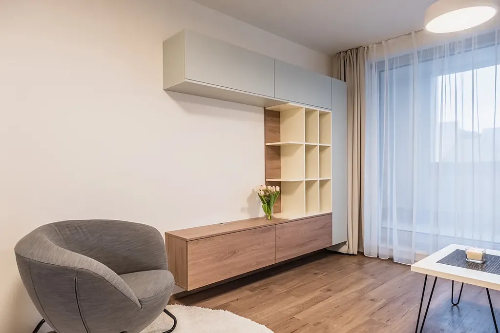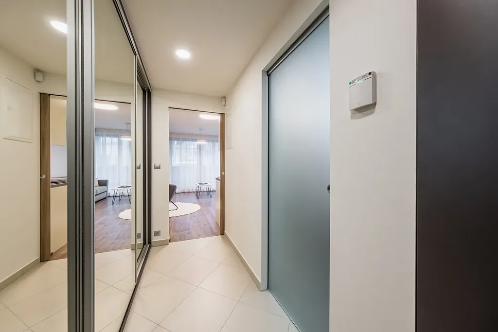 Byt má šikovné dispoziční řešení a dostatek úložných prostor, veškerý nábytek je vyroben na míru. V předsíni se nachází prostorná vestavěná skříň s botníkem a také pračka kombinovaná se sušičkou. Z obývacího pokoje je přístup na prostorný balkon s výhledem do klidné ulice. Kuchyňská linka je vybavena všemi spotřebiči včetně lednice, myčky a kombinované trouby s mikrovlnným ohřevem. Jídelní stůl a židle jsou spojeny s obývacím pokojem, kde je připravena pohodlná rozkládací pohovka. V bytě je samostatné WC a koupelna se sprchovým koutem.