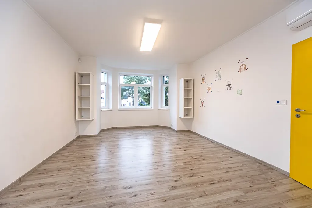 Přízemí: malá čekárna, zázemí pro recepci, místnost s velkým oknem až k podlaze, sociální zařízení a komora.