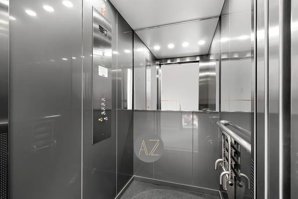 Koupelna v moderním designu je vybavena sprchovým koutem, umyvadlem na skříňce s osvětleným zrcadlem, elektrickým topným žebříkem, přípojkou na pračku a sušičku, bojlerem a závěsnou toaletou.