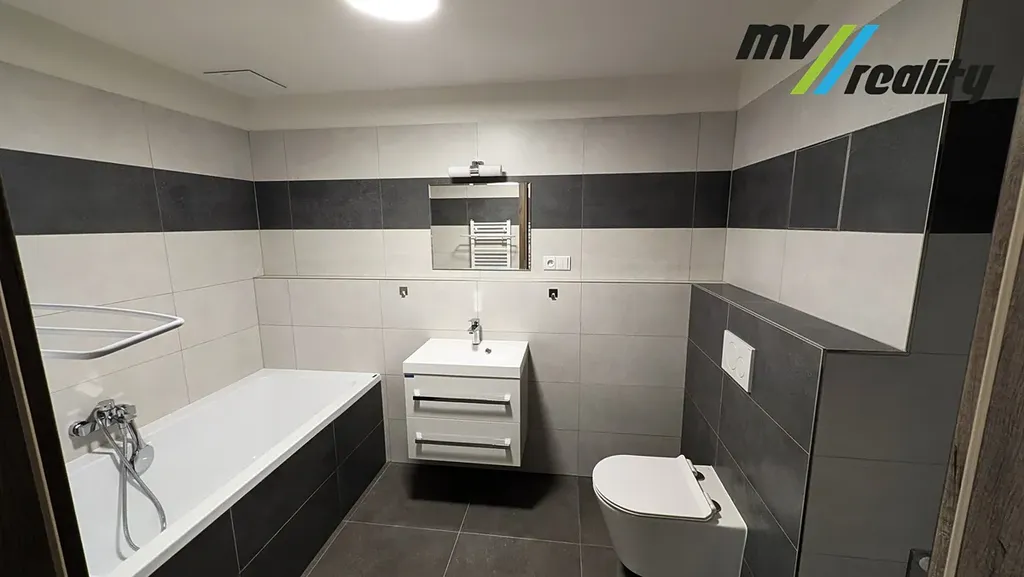 Koupelna je vybavena vanou, WC, připojením na pračku a sušičku. Byt disponuje také praktickou komorou.