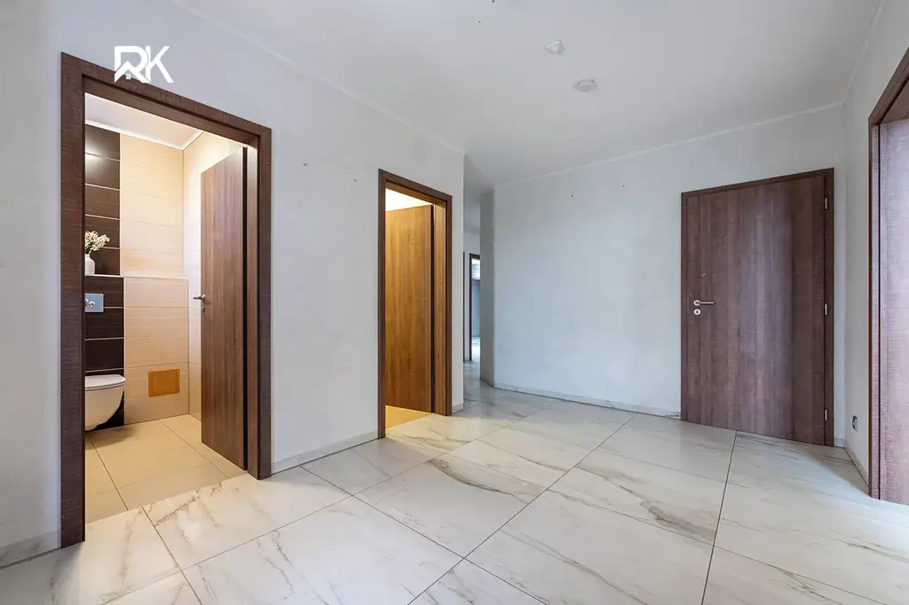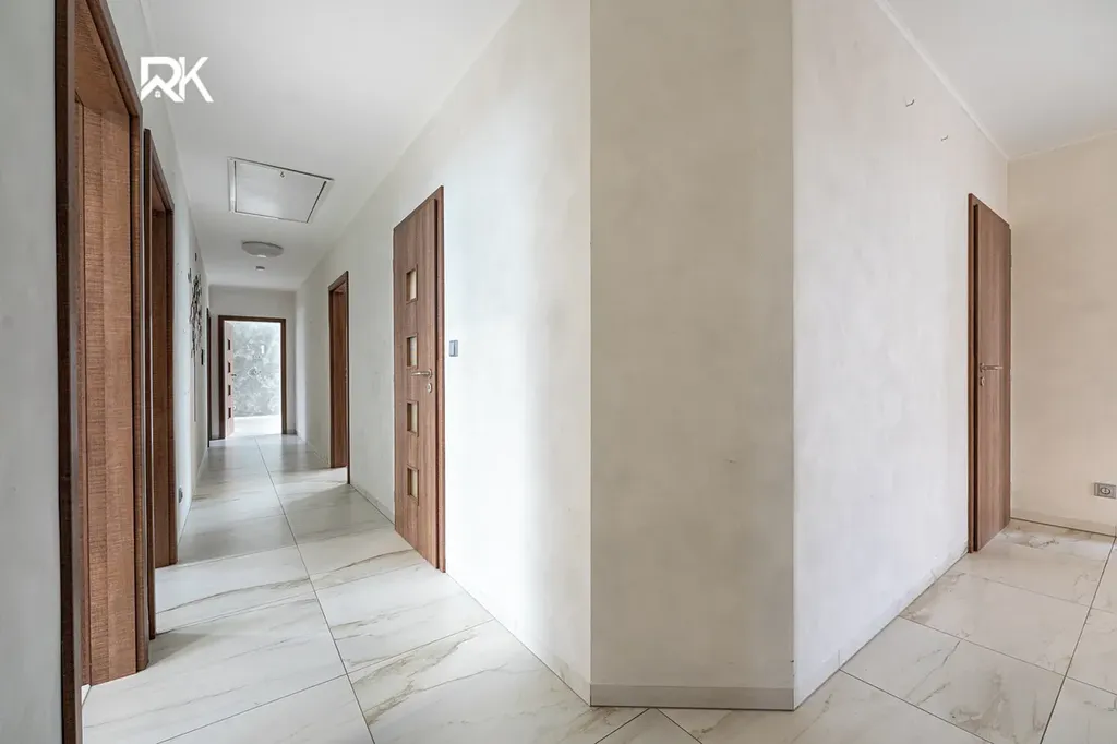K dispozici jsou dvě koupelny, tři samostatné toalety, praktická spíž u kuchyně a další samostatná šatna u vstupu do domu. Další úložný prostor nabízí skladovací místnost v podkroví o velikosti cca 35 m².