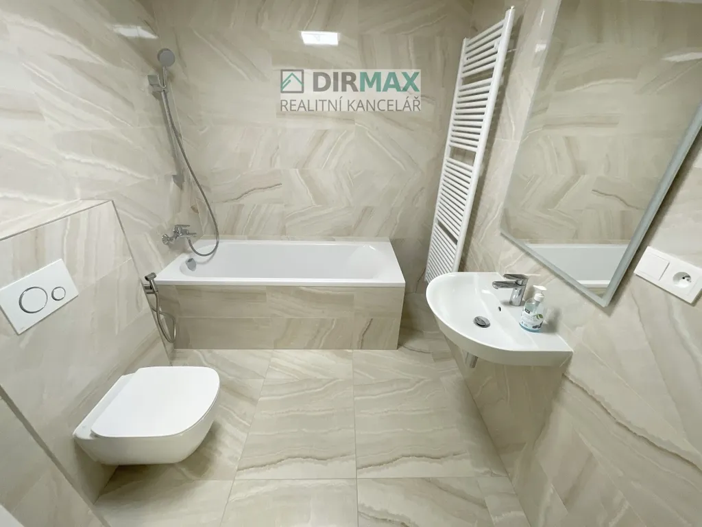 Koupelna je opravdu velice vkusná, kdy z vybavení je tady vana, závěsná toaleta, bidetová sprcha, topný žebřík, umyvadlo a osvětlené zrcadlo. Jsou i přípojky na pračku a na sušičku, kdy spotřebiče mohou být vedle sebe nebo na sobě, je tady dostatek místa pro obě řešení.