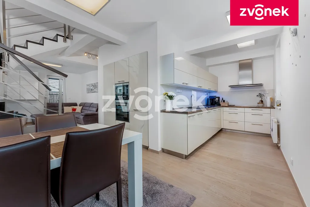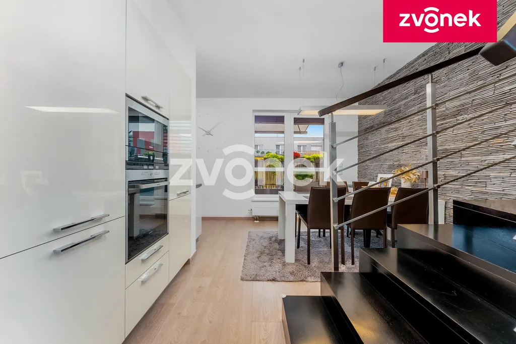 Dispozice bytu: zádveří s vestavěnými šatními skříněmi a vstupem na samostatné WC a do šatny s velkým množstvím úložných prostor. Obývací pokoj s jídelnou a kuchyní se vstupem na terasu a schodištěm do horní části bytu. Kuchyň je plně vybavena vestavěnými značkovými spotřebiči / elektrická trouba, mikrovlnná trouba, myčka na nádobí, lednice s mrazákem, digestoř|/ díky důmyslnému a promyšlenému řešení kuchyň nabízí velké množství úložných prostor jako je např. potravinová skříň s drátěným programem atd. Na rohové terase o ploše 37 m2 se nachází markýza, zahradní posezení, dětský koutek. V jídelně je umístěn velký jídelní stůl se židlemi. Stěna v jídelně a na schodišti je obložena přírodním kamenem. Z obývacího pokoje je vstup do horní části bytu schodištěm s nerezovým zábradlím. V horní části bytu se nachází chodba opět s vestavěnými skříněmi, se vstupem do ložnice se šatnou nabízející velké množství úložných prostor, dětského pokoje a koupelny se sprchovým koutem, společným WC a šatny s úložnými prostory. Všechny pokoje a místnosti jsou vybaveny na zakázku vyrobeným značkovým nábytkem a skříněmi, tyto jsou součástí ceny bytu. Ve všech oknech jsou umístěny elektricky ovládané venkovní protisluneční žaluzie. Byt je ve velmi udržovaném stavu odpovídající téměř novostavbě. K bytu náleží prostorná sklepní kóje o ploše 33,5 m2. Byt se nachází ve velmi klidné části bytové zástavby v lokalitě Kasárna. V blízkosti bytu se nachází, obchodní centrum, městské sportoviště, cyklostezka, dětské hřiště, škola, školka, aqua park, zimní stadion. Centrum města je vzdáleno do 8 min. pohodlnou chůzí. V bezprostřední blízkosti bytového domu je dostatek parkovacích míst. Byt je volný ihned.
