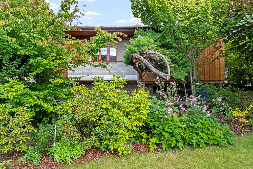 Zahradu s okrasnými a ovocnými dřevinami i dům od lesního pozemku odděluje vysoký zděný plot s brankou a přístupem na lesní pozemek.