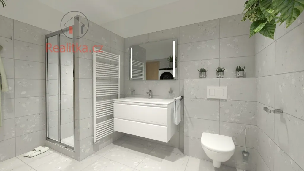 • Přízemí: Prostorná chodba, technická místnost, WC, obývací pokoj s chytře odděleným kuchyňským koutem a terasa navazující na obývací pokoj, čímž se vytváří plynulý přechod mezi interiérem a exteriérem.