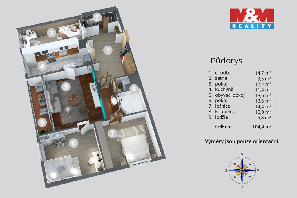Celková plocha bytu včetně příslušenství činí 98,7 m². Byt má velmi praktickou a vyhledávanou dispozici. Jednotlivé pokoje jsou samostatné, neprůchozí, což zajišťuje dostatek soukromí pro všechny členy domácnosti. Dominantou bytu je prostorná vstupní chodba s vestavěnými skříněmi, která nabízí dostatek úložného prostoru. Kuchyně je vybavena sporákem a myčkou. Koupelna je zděná s velkou vanou, toaleta je oddělena. Z lodžie i oken bytu je příjemný výhled do okolí. Dům je udržovaný a plně funkční, k dispozici je výtah. Lokalita nabízí veškerou občanskou vybavenost v pěší dostupnosti – obchody, služby i další potřebná infrastruktura. Přímo naproti domu se nachází večerka. V okolí nádherná příroda. Byt je ideální pro rodinné bydlení i jako investice.