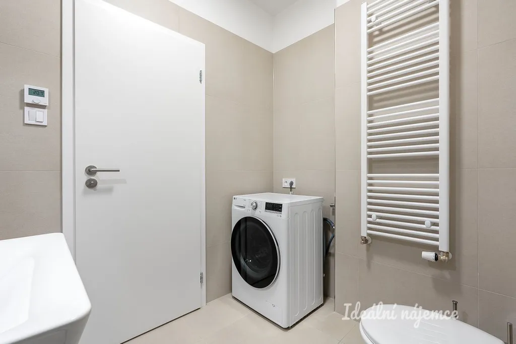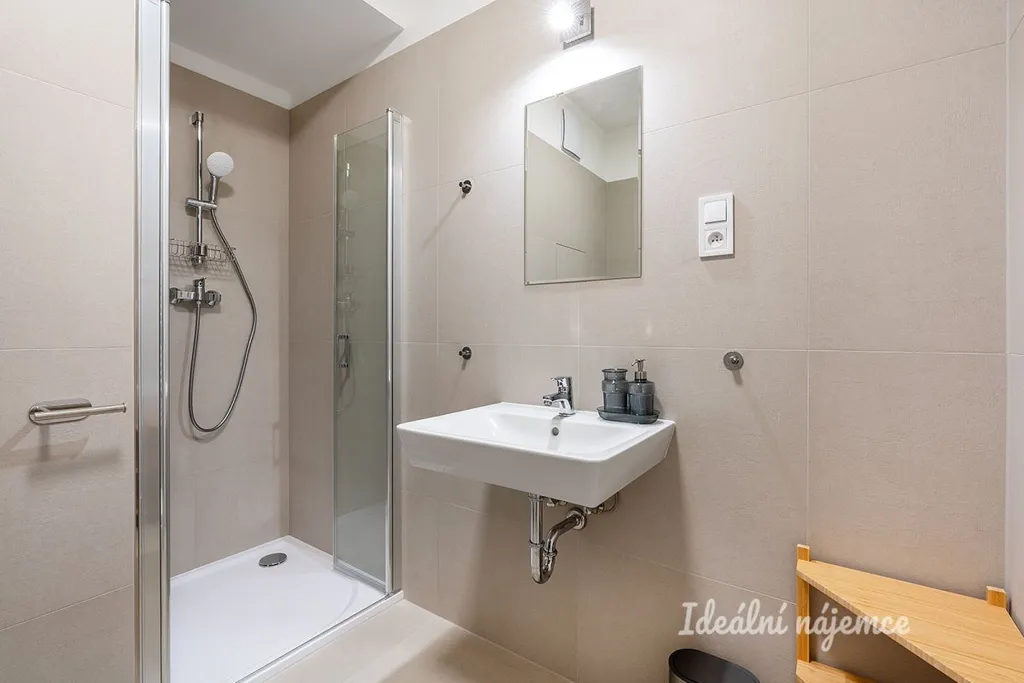 Koupelna je provedena v moderním standardu s důrazem na detail – nabízí prostorný sprchový kout s nízkým nástupem, závěsné WC, umyvadlo se zrcadlem a pračku. Komfort doplňuje podlahové vytápění a topný žebřík. Velkoformátová dlažba v příjemném dekoru podtrhuje čistý a nadčasový vzhled.