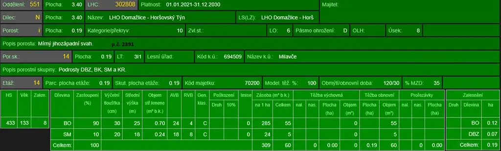 - p.č. 2391 vedená jako lesní pozemek o celkové výměře 1 935 m2 (stáří lesa 138 let - zastoupení dřevin borovice, smrk).