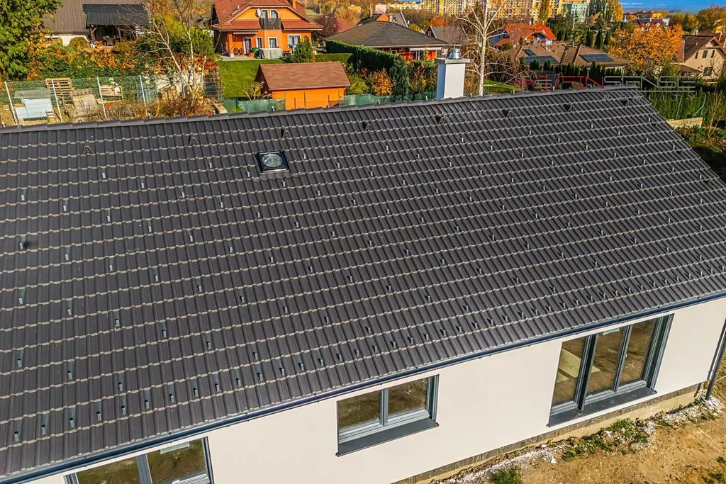 Exteriér domu je dokončený včetně parapetů, předokenních žaluzií a finální fasádní vrstvy.