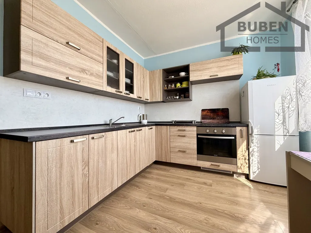 Byt tvoří zádveří s komorou, chodba, kuchyň s jídelním koutem, obývací pokoj, ložnice, koupelna s vanou a samostatné WC.