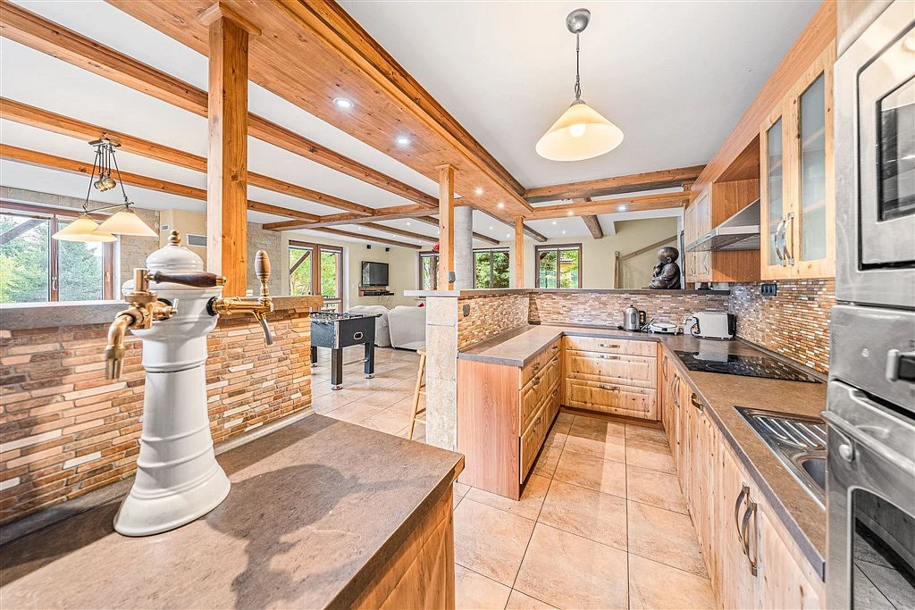 Srdcem domu je prostorná společenská místnost s krbem a plně vybavenou kuchyní, která vybízí ke společným chvílím po dni stráveném na svahu či v přírodě. Přímo navazuje velká zastřešená terasa, ideální pro posezení s výhledem na okolní šumavskou krajinu.