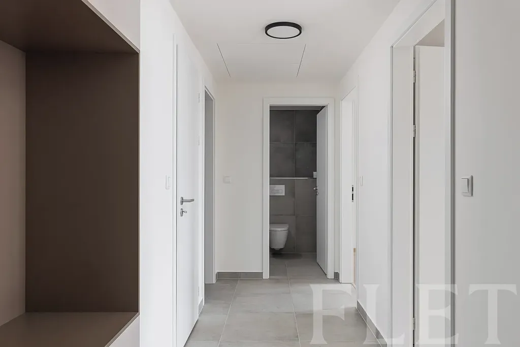 Dominantou bytu je prostorný obývací pokoj s moderním kuchyňským koutem, který nabízí opravdu velkorysou pracovní i úložnou plochu – ideální pro každého, kdo rád vaří nebo tráví čas s rodinou. Kuchyně je vybavena všemi vestavnými spotřebiči včetně indukční desky, trouby, mikrovlnné trouby, myčky i lednice s mrazákem. Dispozice dále zahrnuje dvě samostatné ložnice, přičemž nechybí dostatek úložných prostor – vestavěná skříň v předsíni, velká šatní skříň v ložnici a samostatná místnost vhodná jako šatna či komora. Koupelna a toaleta jsou oddělené, což přispívá k vyššímu komfortu bydlení.