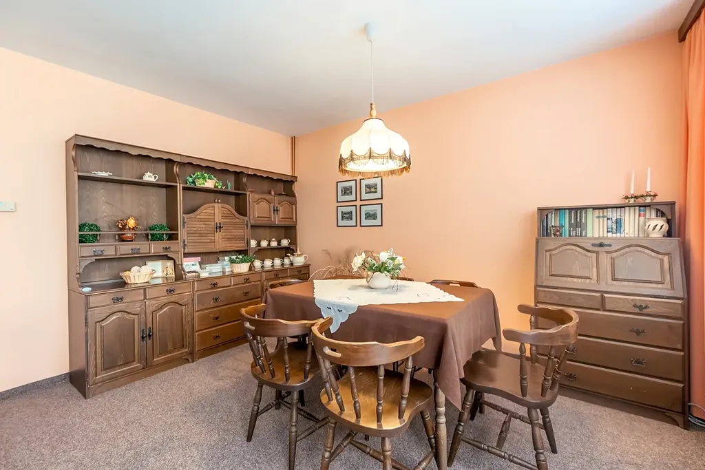 V přízemí vás přivítá světlý obývací pokoj s pohodovým vstupem na terasu – ideální místo pro rodinné setkání či odpočinek s knihou či šálkem čaje. Kuchyně s kuchyňskou linkou do tvaru L , s oknem do zahrady, které vám umožní sledovat krásu okolí při vaření nebo relaxaci.