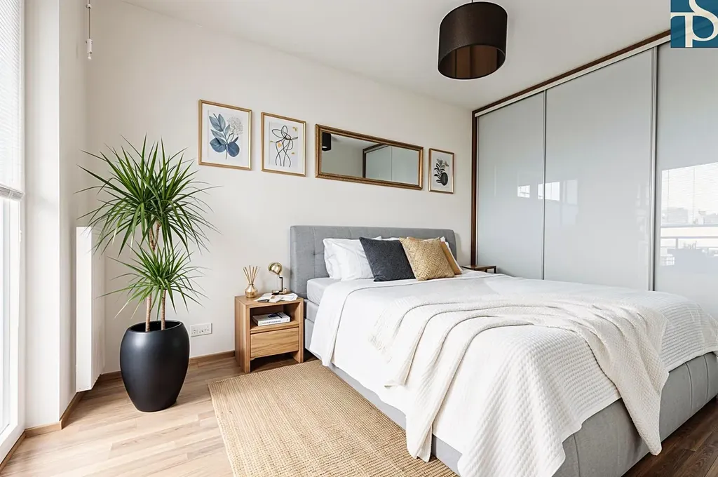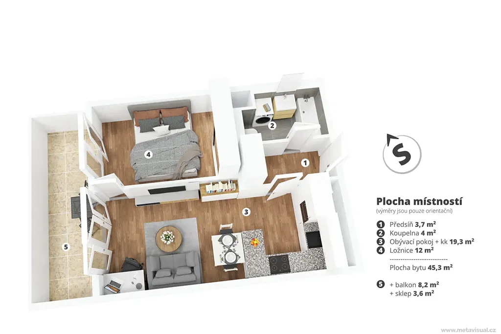 Dispozice bytu je promyšlená tak, aby dávala smysl každodennímu životu. Obývací část s kuchyňským koutem tvoří srdce bytu, zatímco ložnice nabízí klid a soukromí. Dále je v bytě prostorná předsíň, které dominuje vestavná skříň a velká koupelna. Celý prostor působí vzdušně a příjemně.