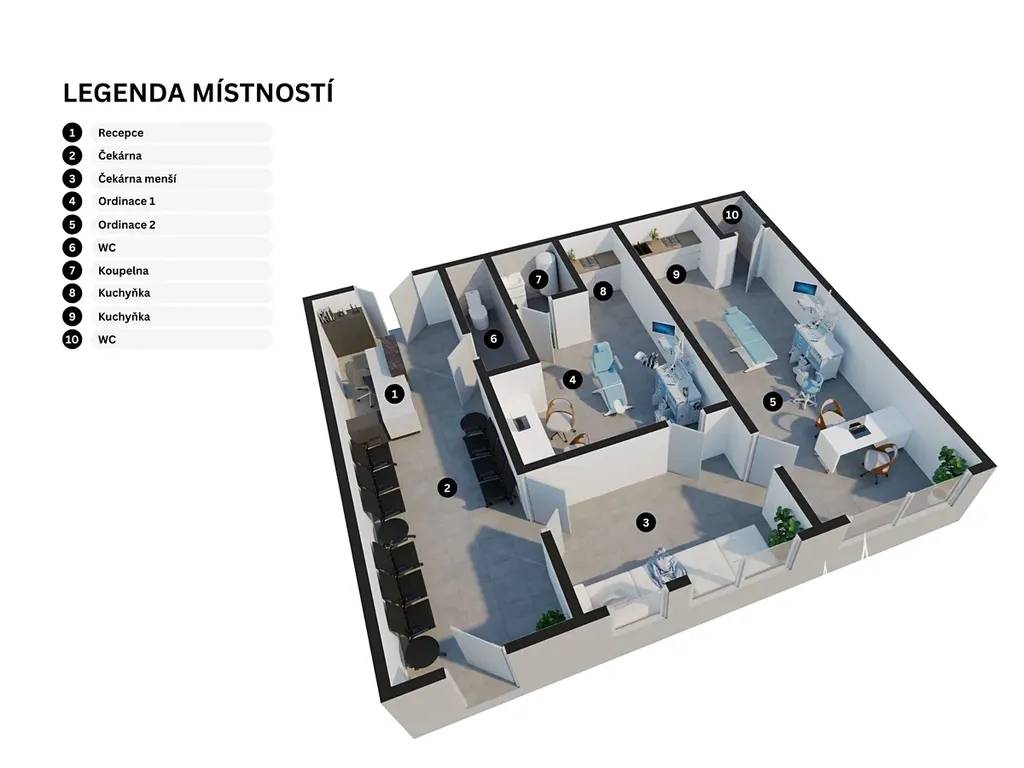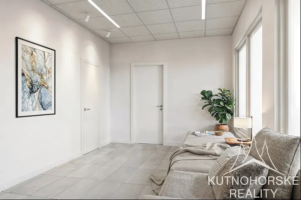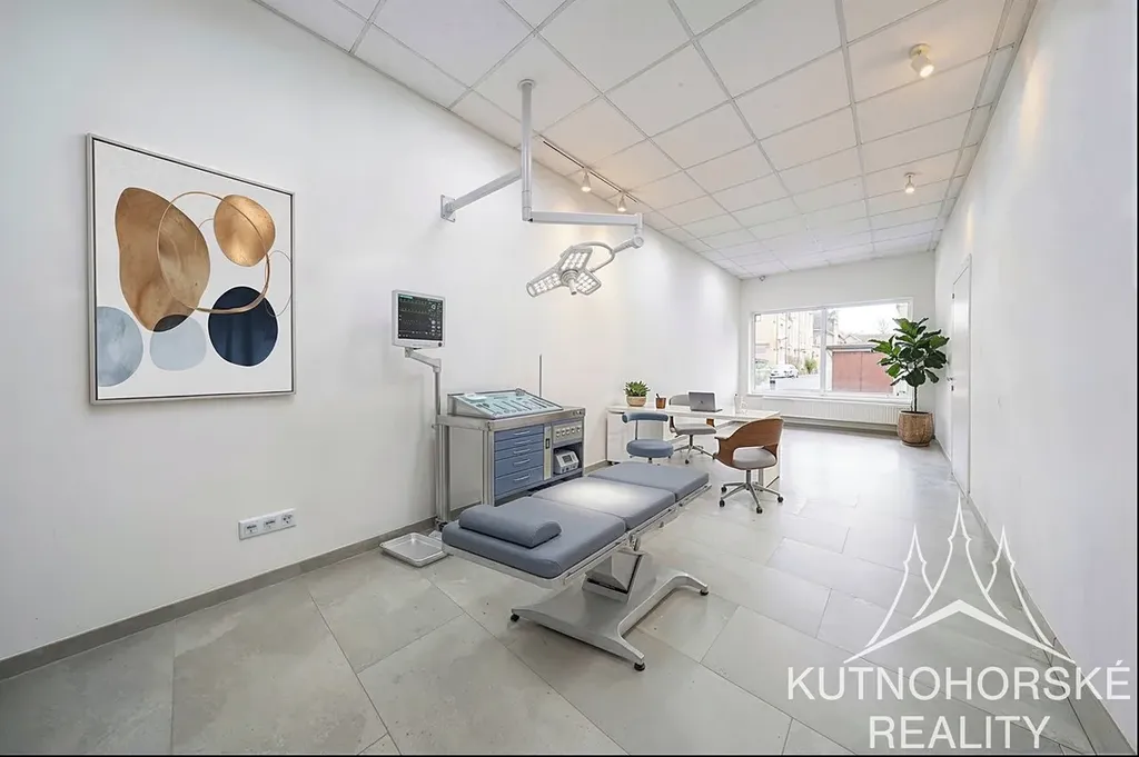 V přízemí se nachází otevřený prostor o celkové ploše 120 m², který prošel kompletní rekonstrukcí a nabízí moderní zázemí pro medical centre nebo kanceláře, prodejnu, salon, či cokoliv jiného. Včetně samostatného WC a technické místnosti s kuchyňkou (přiložené fotografie "medical centre" jsou pouze vizualizace a slouží pro lepší představivost k využití prostoru).