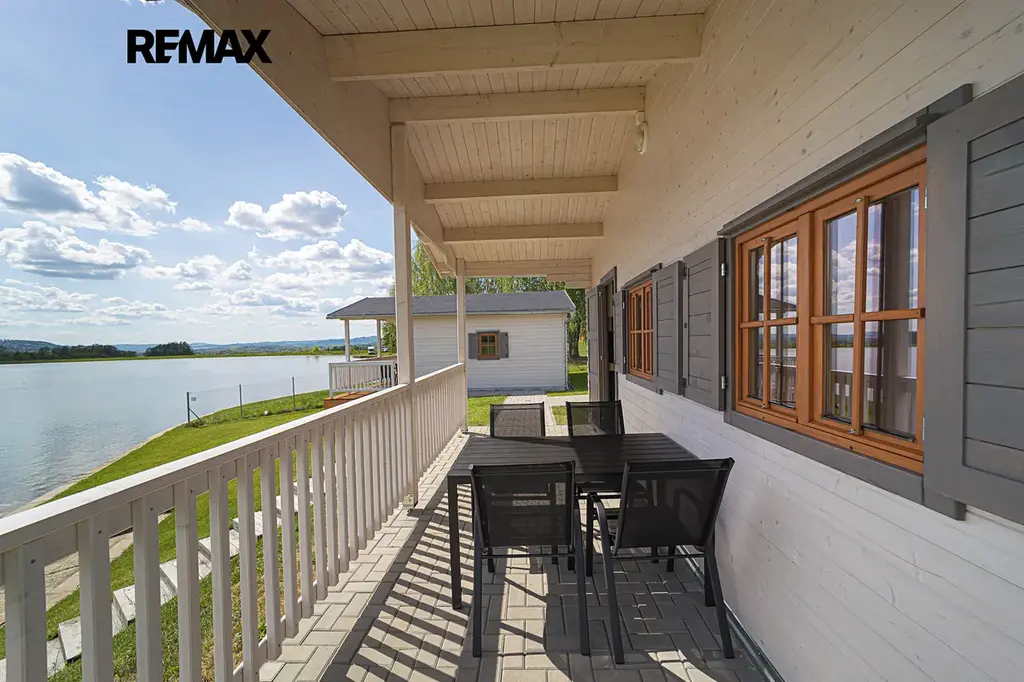Terasa - Každá chatka má zastřešenou terasu (10 m²) s relaxačním výhledem přímo na hladinu přehrady.
