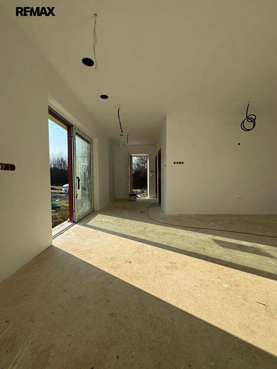 Exkluzivně nabízíme menší novostavbu na krásném koncovém pozemku o velikosti1058 m2. Příjemná velikost poskytuje novému majiteli široký záběr vlastní realizace (skleník, garáž, posezení, bazén, vířivka, kurník, kotec ap.) Taktéž poskytuje dostatečné soukromí. Vlastní dům je menších rozměrů (6,5 x 11,35m). Vchodem se dostaneme do prostorné chodby (3,8m2), ze které se dostaneme do technické místnosti (4m2), ve které se počítá s elektrokotlem, umístění rekuperace, pračky a sušičky na prádlo. Dále je koupelna s WC (9,6m2), obývací pokoj s kuchyní (20,2m2), ložnice (11,5m2) ke které patří samostatná velká šatna (4,8m2). Nad těmito prostory vede půda, ale neumožňuje pohyb ve stoje. Dům je situován k maximální úspoře energií. Kvalitní portálová okna na jižní stranu zajišťují vytápění i v zimních měsících. Topení v domě je řešeno podlahovým vytápěním a skvěle řešenou rekuperací. Dům je napojen na obecní vodovod, přitom ještě disponuje vlastní kopanou studnou. Chybět nebude ani kompletní výstavba čističky odpadních vod a svedení dešťové vody do retenční nádrže. Na fotkách je ještě vidět rozpracovanost stavby, ale k prodeji bube vše srovnáno a vyklizeno. Dům je řešen bezbariérově. Nový majitel má příležitos dodělat prostory dle svého vkusu a může okamžitě bydlet. Veškerá byrokracie je již vyřízena.