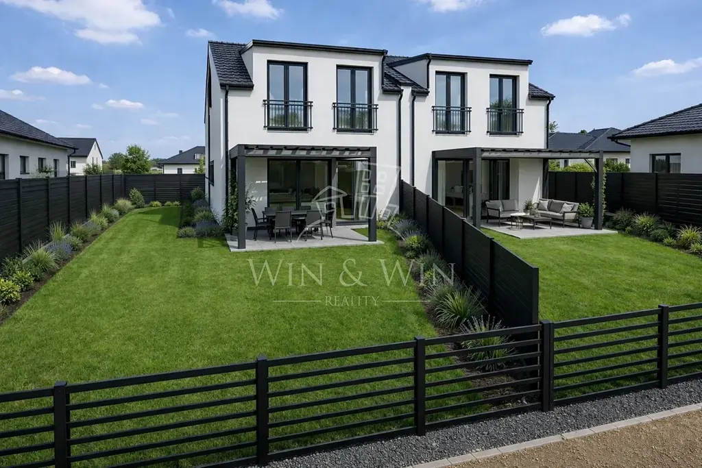 Zahrada je prakticky řešená, snadno udržovatelná a plně funkční. Díky orientaci od jihovýchodu na jihozápad si zde užijete slunce po celý den. Nabízí prostor pro relax, dětské hry i posezení s přáteli. Součástí je také zakopaná betonová retenční nádrž na dešťovou vodu. Pozemek bude kompletně upraven, zatravněn a oplocen, přičemž přední část bude řešena moderním gabionovým plotem, který esteticky ladí s celkovým stylem domu.