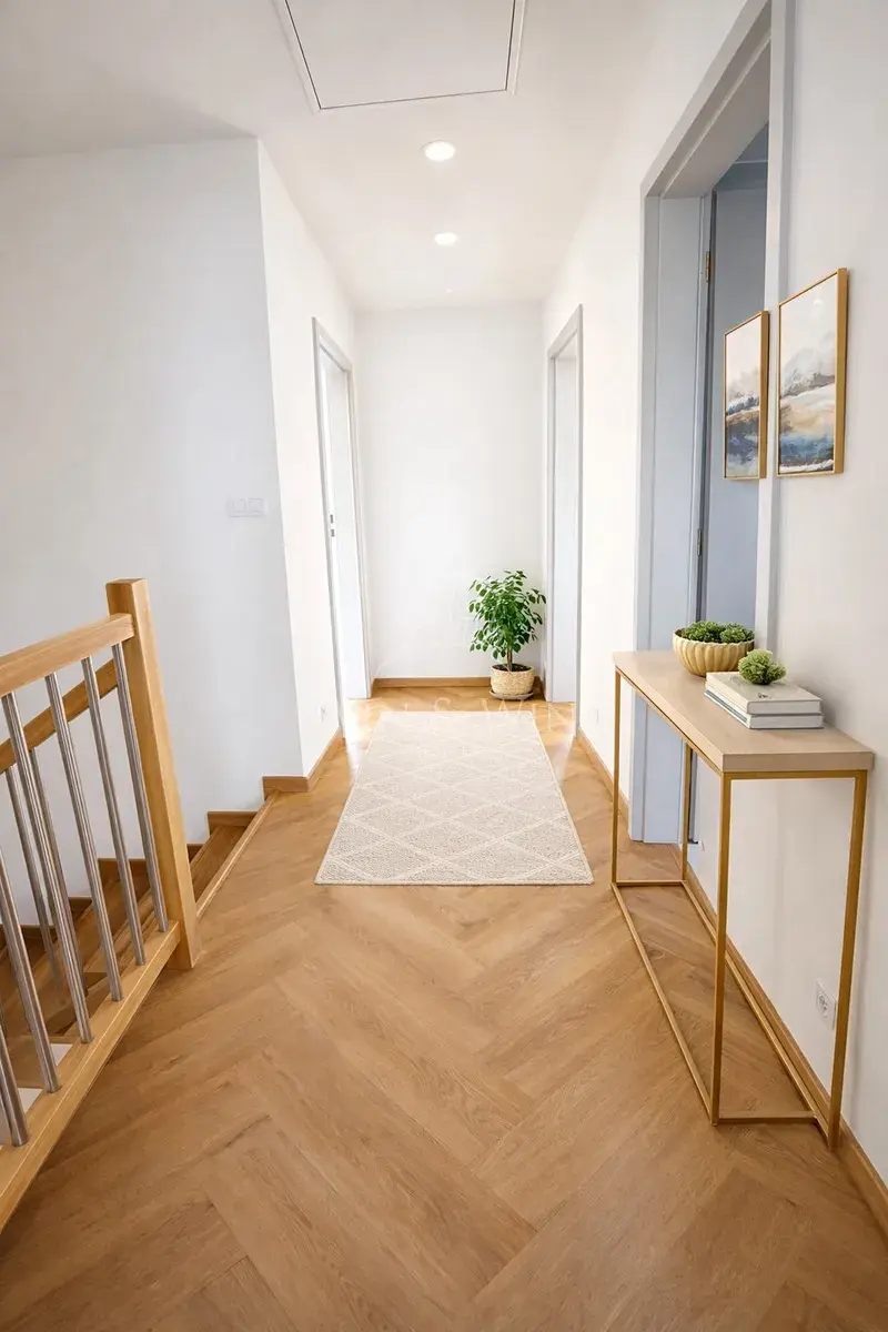 Horní patro nabízí dostatek soukromí pro každého člena rodiny – dva prostorné dětské pokoje, ložnici s vlastní šatnou a druhou koupelnu. V domě nechybí velká technická místnost ani prostorné zádveří, které oceníte při každodenním provozu. Samozřejmostí je také bidetová sprcha na toaletě.