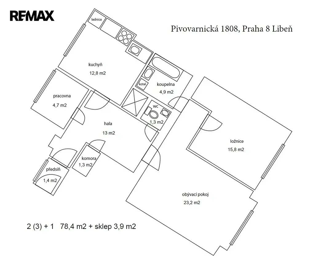 Za vstupními dveřmi je předsíň (1,5m2) osvětlená oknem ze skleněných tvárnic, odtud se dostaneme do prostorné haly (13 m2), která je vybavena šatní skříní. Z haly vejdeme do světlé a prostorné kuchyně (12,8 m2), kam se pohodlně vejde i stůl a židle. Kuchyň je vybavená lednicí s mrazákem, kuchyňskou linkou a plynovým sporákem s digestoří. Dále je z haly přístupná menší pracovna (4,7 m2), s velkým oknem, kam by se případně vešla i postel a psací stůl a může z ní být menší studentský pokojík. Z haly je přístupné i WC s umyvadlem a také komora, (obojí 1,3 m2). Největší obytný pokoj (23,2 m2) je také přístupný přímo z haly a má orientaci do ulice Pivovarnická. Odtud se menší chodbičkou dostaneme ke koupelně (4,9 m2) vybavené vanou a umyvadlem a také pračkou a plynovým kotlem, ale také do větší ložnice (15,8 m2). Zde je šatní skříň a může, pokud bude zájem, zůstat palanda. Není problém ji ale demontovat a odvézt. Jinak se byt pronajímá prázdný, s možností si byt zařídit dle vašeho vkusu a potřeb.