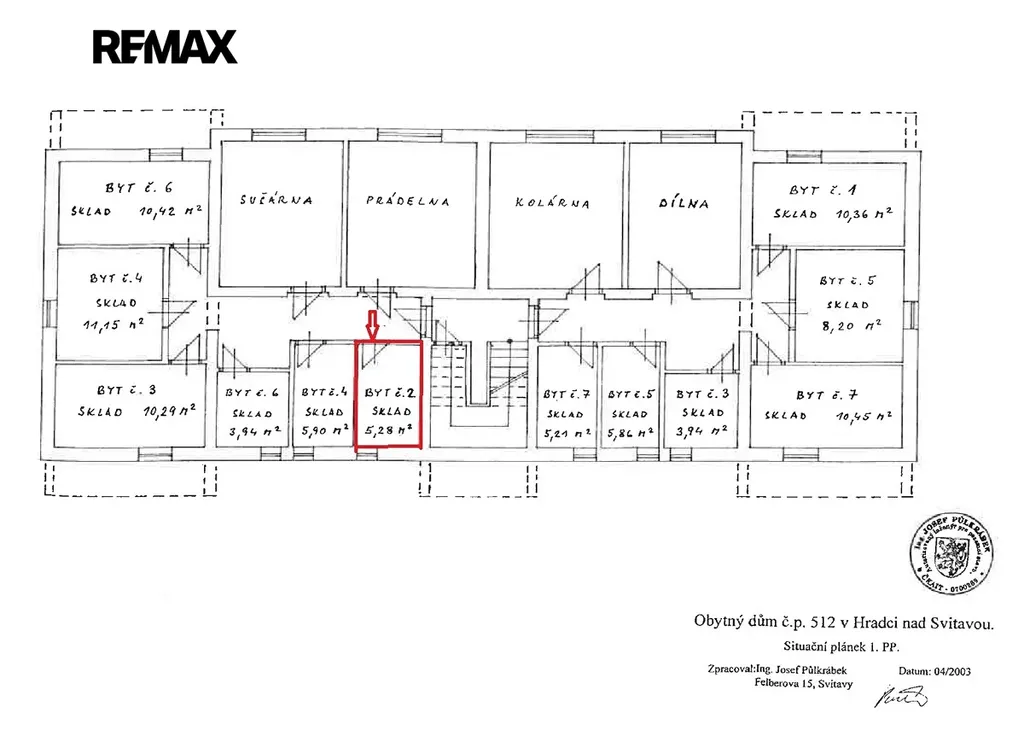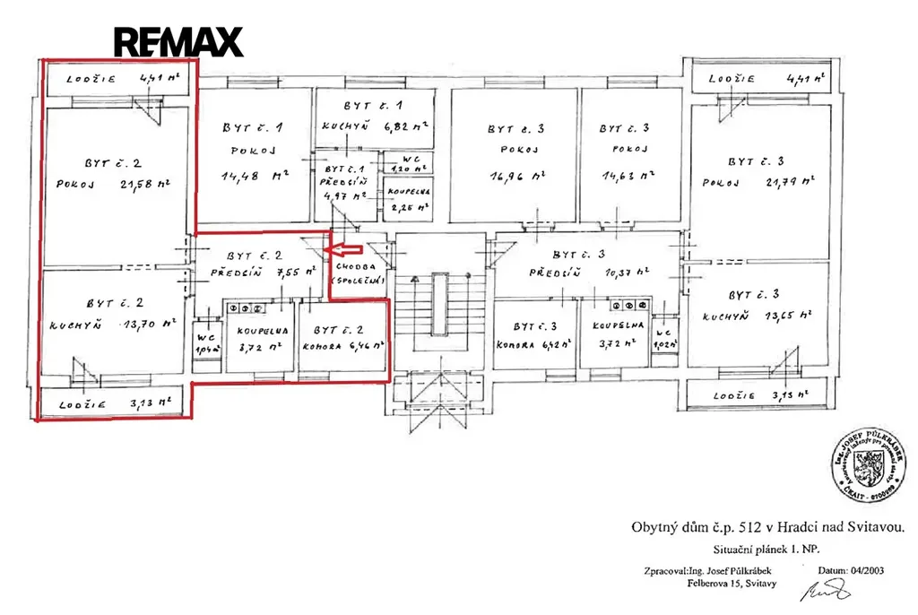 Celková užitná plocha bytu s přísl., tedy včetně sklepa a dvou lodžií činí 66,91 m2, samotná plocha bytu 55,13 m2. Zděný sklep v suterénu domu má výměru 5 m2. Byt má nová plastová okna, včetně balkónových dveří, v bytě dále proběhla modernizace sociální zařízení, kdy byla vyměněna vana za sprchový kout. Byt má vlastní plynové vytápění včetně ohřevu teplé vody.