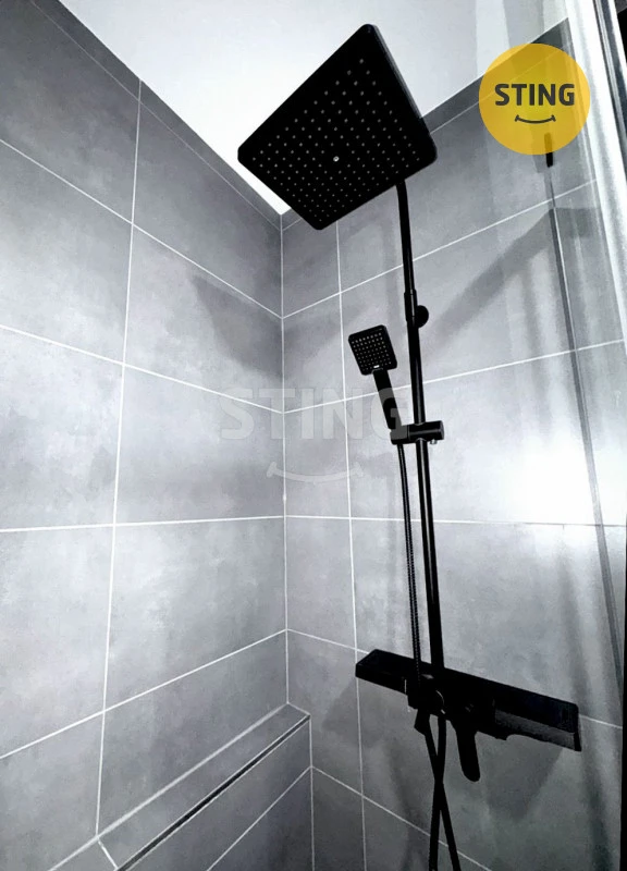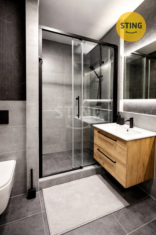 Koupelna je řešena ve stylovém tmavém provedení a nabízí prostorný sprchový kout s moderními prvky, závěsné WC a designové umyvadlo se skříňkou. Je zde vyhrazený prostor pouze pro menší pračku s vrchním plněním.  Samozřejmostí je i vyhřívaný žebřík na ručníky.