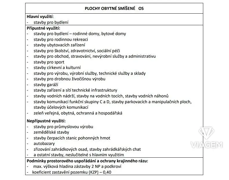 Dle platného územního plánu je pozemek veden jako plocha smíšená obytná, což umožňuje výstavbu rodinného domu. Zároveň se jedná o pozemek s velmi širokými možnostmi využití, například pro stavbu rekreační chaty, bytového domu, garáží nebo ubytovacího zařízení. Další přípustné využití vychází z textové části územního plánu, která je přiložena přímo v galerii inzerátu.