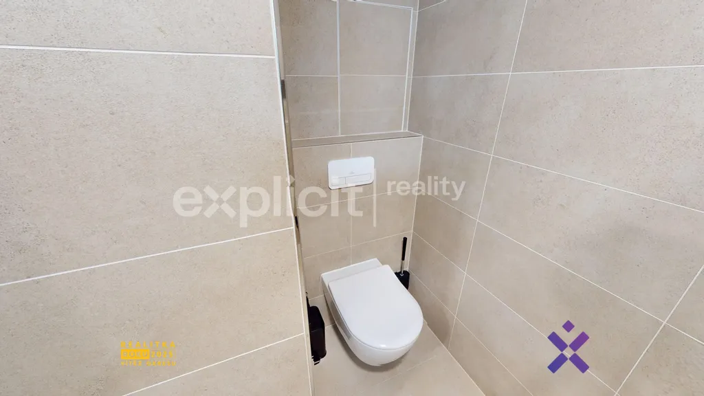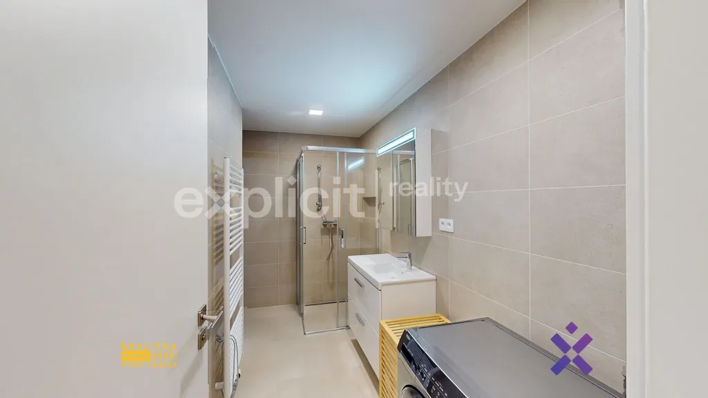 Naproti pokoje je koupelna se sprchovým koutem a topným žebříkem. Součástí koupelny je i toaleta.