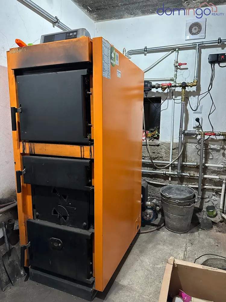 > ekologický kotel na dřevo, kterým se dům převážně vytápí