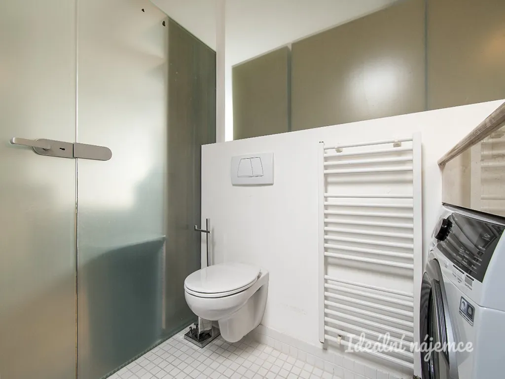Naproti kuchyni jsou schody, které vedou do druhého patra. Pod a za schody jsou úložné prostory. Vedle kuchyně můžeme nalézt vstup do mezipatra, kde se nachází dětský pokoj a koupelna s toaletou. V druhém patře se nachází pracovní stůl s židlí, druhá koupelna s pračkou a ložnicí. Součástí ložnice je i knihovna a prostorná šatna. Po celém bytě jsou dřevěné a laminátové podlahy a klimatizace. Na oknech jsou elektrické rolety.