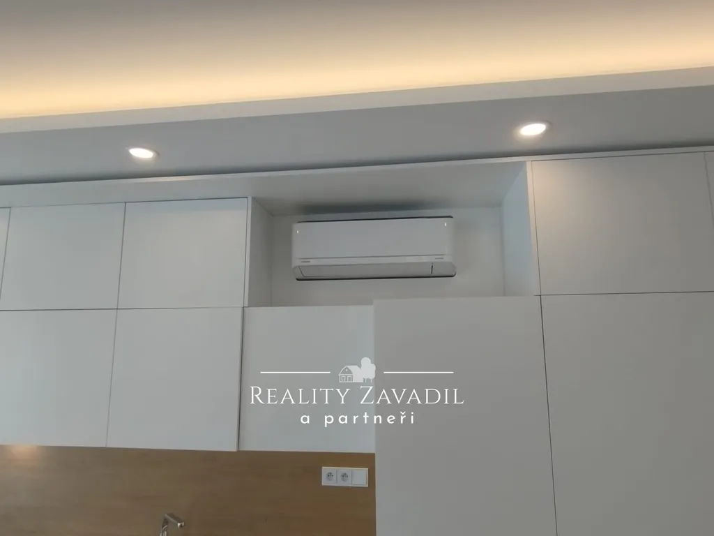 Dominantou bytu je světlý obývací prostor propojený s moderní kuchyní, kde nechybí žádný spotřebič včetně klimatizace.